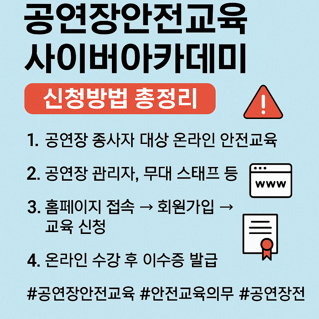오늘은 2025년 기준 공연장안전교육 사이버아카데미 대상, 신청방법, 교육 내용, 유의사항까지 총정리해드리겠습니다. 🎭🛡️